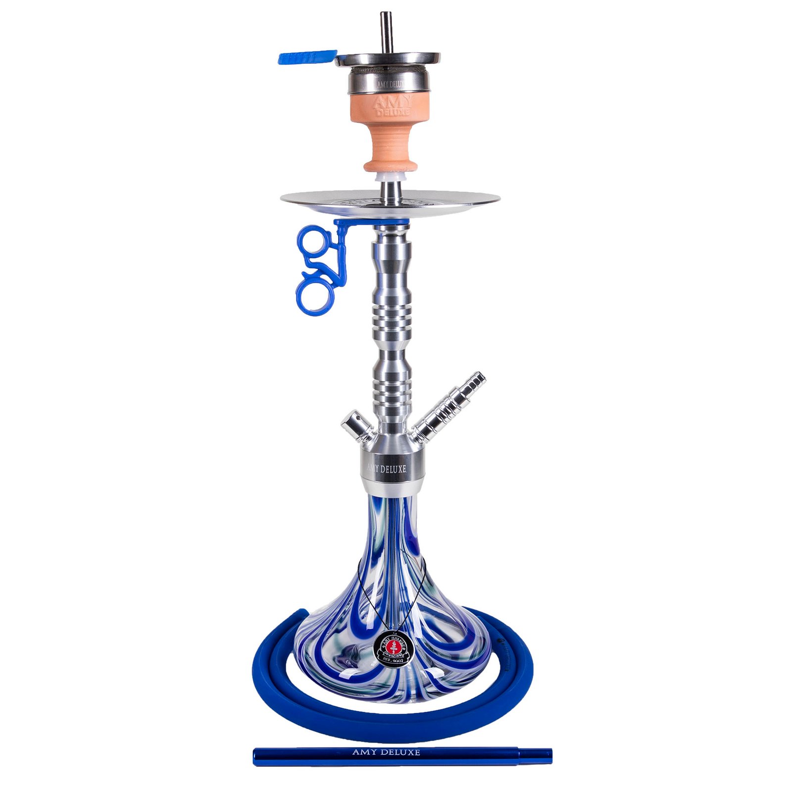 De waterpijp wordt geleverd met een wasbare silicone slang en een stijlvol RVS mondstuk, wat ideaal is voor het roken van verschillende smaken. Het model biedt de mogelijkheid om meerdere slangen aan te sluiten, wat het delen van een rooksessie met vrienden extra plezierig maakt. De set wordt compleet geleverd met de Amy Deluxe Hot Screen tabakskop, kolentang en bijpassende accessoires.